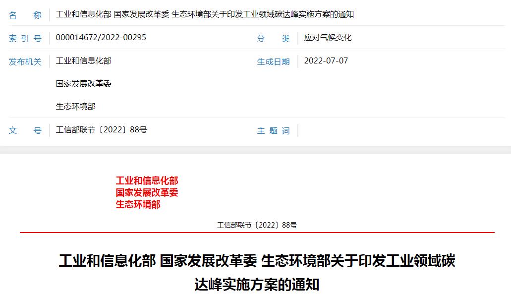《工業(yè)領域碳達峰實施方案》已經碳達峰碳中和工作領導小組審議通過,現印發(fā)給你們,請認真貫徹落實。