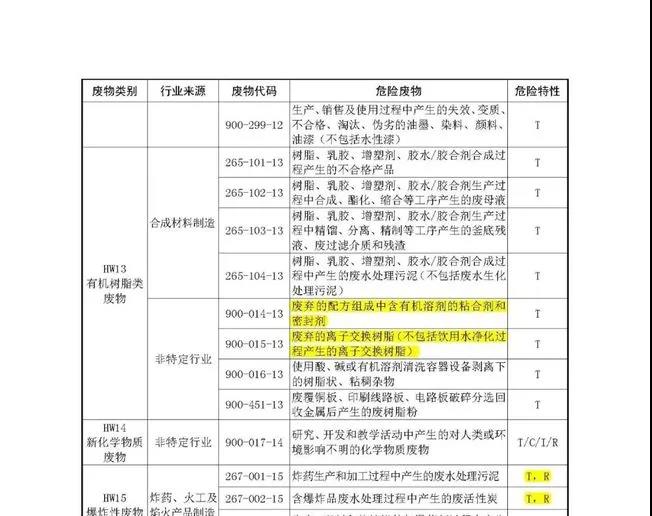 7.明確部分類別廢物的涵蓋范圍。2016 年版《名錄》中對樹脂、乳膠、增塑劑生產過程中產生的危險廢物的界定不清晰,導致涵蓋范圍過大。實際調研發(fā)現(xiàn)不同來源的上述廢物危險特性存在較大的差異。根據危險特性調查結果,本次修訂將其中危險特性較小、環(huán)境風險可控的廢物從《名錄》中刪除。